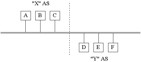 A fenti ábrán az X és Y AS-ek megegyeztek a Z AS-sel (szolgáltatóval), hogy forgalmukat rajta keresztül bonyolítják és ezért fizetnek. Azonban X és Y nagyon közelálló szervezetek és egymással igen sokat kommunikálnak, célszerûnek tartják tehát, ha egymásnak küldött csomagjaikat közvetlenül adják át egy saját összeköttetésen és nem pedig Z-n keresztül. Ezért létrehoznak egy hátsó" link-et, mely sokkal olcsóbb, mint Z. Tekintsük a dolgot az X AS szemszögébôl. E kifelé terjeszteni fogja az összes X-ben lévô hálózatot, hogy Y-ból feléje áramoljon a forgalom. Ezeknek a hálózatoknak információi az IGP protokoll segítségével el fognak jutni a C router-be is, amely azonban nem terjeszti ôket, hogy a Z-bôl jövô forgalom ne raja (és így Y-on), hanem az A router-en keresztül áramoljon X-be. Hasonlóképp, a Z-tôl, C által megismert célpontokat az IGP el fogja juttatni F-be, de az nem terjeszti E felé, hiszen az X-bôl Z-be (vagy távolabb) küldendô csomagokat nem az Y-on át, hanem közvetlenül Z-nek kell küldeni, A-n keresztül.