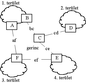 Ha egy terület például az 1. kettészakad, de mindkét része kapcsolatban marad a gerinccel, akkor a topológiai adatbázisok szinkronizációja után a két router csak azokat a célpontokat fogja terjeszteni a gerincre, melyek az ô felében vannak. Így elkerülhetô az, hogy a területnek szóló csomagok rossz félbe kerülnek és így nem jutnak el a címzetthez. Ez a probléma már a RIPv1-nél fölmerült a subnet hiding módszerével kapcsolatban. Ha a gerinc szakad szét úgy, hogy egy területen keresztül megmarad még az összeköttetés (például, ha az ef link szakad meg, akkor az 1. területen keresztül képes még kommunikálni a 3. és a 4. terület), akkor az OSPF alaphelyzetben nem képes fenntartani a konnektivitást. Ezen a problémán segítendô létrehozhatunk az A és B router-ek között egy virtuális link-et, ami az 1. területen át vezet. Az ilyen link költsége kiadódik az 1. terület topológiájából. Ezt a link-et az A és B router link-state rekordban a Flooding protokoll segítségével terjeszteni fogja a gerincben, így ha az ef link megszakad, a gerinc összeköttetése megmarad, ezen a virtuális link-en keresztül. A gerincen átküldött csomagok (például E-tôl F-nek) pedig valójában elhagyják a gerincet. A virtuális link azonban nemcsak hiba esetén kerülhet használatba, hanem akkor is, ha olcsóbb, mint a gerinc fizikai link-jei. Például egy D-tôl F-be küldött csomag haladhat a cd, bc, virtuális link, af útvonalon, ha ez olcsóbb, mint a cd, ce, ef. Ez persze felettébb valószínûtlen, hisz a gerinc link-jei valószínûleg gyorsabbak, mint a területekéi, hisz a virtuális link fizikailag több link egymásutánja lehet.