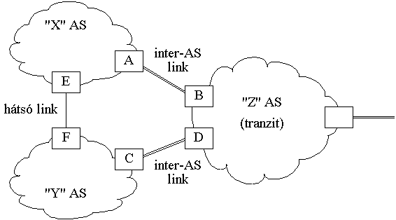 A fenti ábrán az X és Y AS-ek megegyeztek a Z AS-sel (szolgáltatóval), hogy forgalmukat rajta keresztül bonyolítják és ezért fizetnek. Azonban X és Y nagyon közelálló szervezetek és egymással igen sokat kommunikálnak, célszerûnek tartják tehát, ha egymásnak küldött csomagjaikat közvetlenül adják át egy saját összeköttetésen és nem pedig Z-n keresztül. Ezért létrehoznak egy hátsó" link-et, mely sokkal olcsóbb, mint Z. Tekintsük a dolgot az X AS szemszögébôl. E kifelé terjeszteni fogja az összes X-ben lévô hálózatot, hogy Y-ból feléje áramoljon a forgalom. Ezeknek a hálózatoknak információi az IGP protokoll segítségével el fognak jutni a C router-be is, amely azonban nem terjeszti ôket, hogy a Z-bôl jövô forgalom ne raja (és így Y-on), hanem az A router-en keresztül áramoljon X-be. Hasonlóképp, a Z-tôl, C által megismert célpontokat az IGP el fogja juttatni F-be, de az nem terjeszti E felé, hiszen az X-bôl Z-be (vagy távolabb) küldendô csomagokat nem az Y-on át, hanem közvetlenül Z-nek kell küldeni, A-n keresztül.