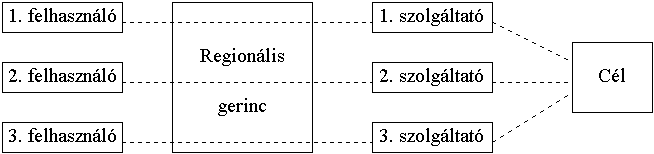 Mind a 3 felhasználó és mind a 3 távolsági szolgáltató a regionális gerincre csatlakozik. Ha egy bizonyos célpont felé mind a 3 szolgáltató ismer utat, akkor a regionális gerincnek választania kell az adott cél felé egy szolgáltatót, amit a felhasználók felé terjeszt. Ez valószínûleg a legkisebb költséget reklámozó szolgáltató lesz, mondjuk a 2.
