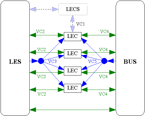 Harmadik lépésként a LEC csatlakozik a BUS-hoz. Ehhez elôször elkéri a 0xFFFFFFFFFFFF broadcast MAC címhez tartozó ATM címet a LES-tôl (ez a BUS címe), majd létrehoz egy pont-pont kapcsolatot a BUS-hoz (VC4), a BUS pedig felveszi a LEC-et saját pont-multipont kapcsolatába (VC5). Ezzel a LEC készen áll az adatok adására, vételére.